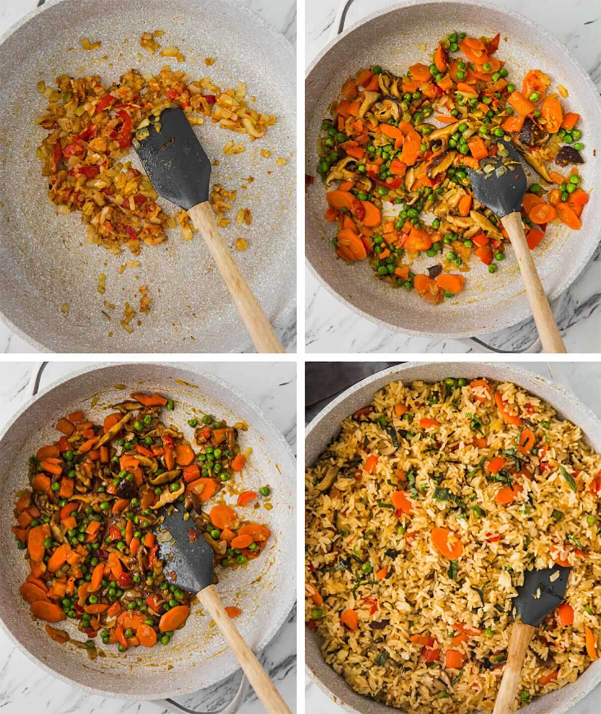 - Cook rice well in advance and let it cool down completely before adding them to the veggies. Leftover rice will also work great in such recipes. Gently fluff the rice using a fork to separate the grains before adding them into the pan or wok.